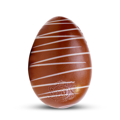 Figurină de Paște, în formă de ou, din ciocolată cu lapte și cu linii fine din ciocolată albă. Poză cu titlu de prezentare.