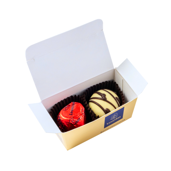 Un Ballotin cu două praline din ciocolată belgiană de cea mai bună calitate. O alegere excelentă pentru un mini cadou dulce, de oferit la evenimentele speciale din viața ta. Poza este cu titlu de prezentare, iar pralinele pot diferi.