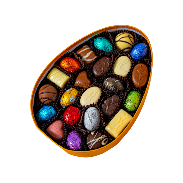Cutie cadou de Paște, verde, în formă de ou, cu design tematic, ce conține 23 de praline belgiene. Punga de cadou și hârtia din mătase sunt incluse. Poza este cu titlu de prezentare, iar pralinele și panglica pot diferi.