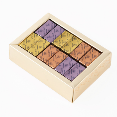 Selecție 24 praline ciocolată cu lapte (3 sortimente) în cutie elegantă. Pungă cadou și hartie mătase incluse. Poza este cu titlu de prezentare iar pralinele și panglica pot diferi.