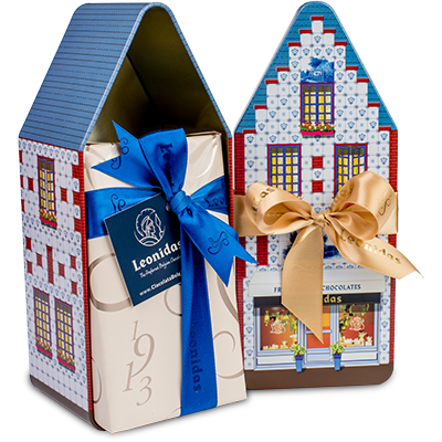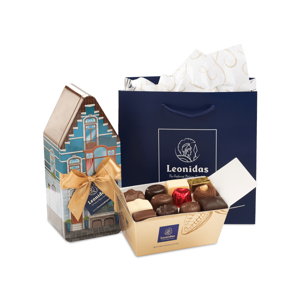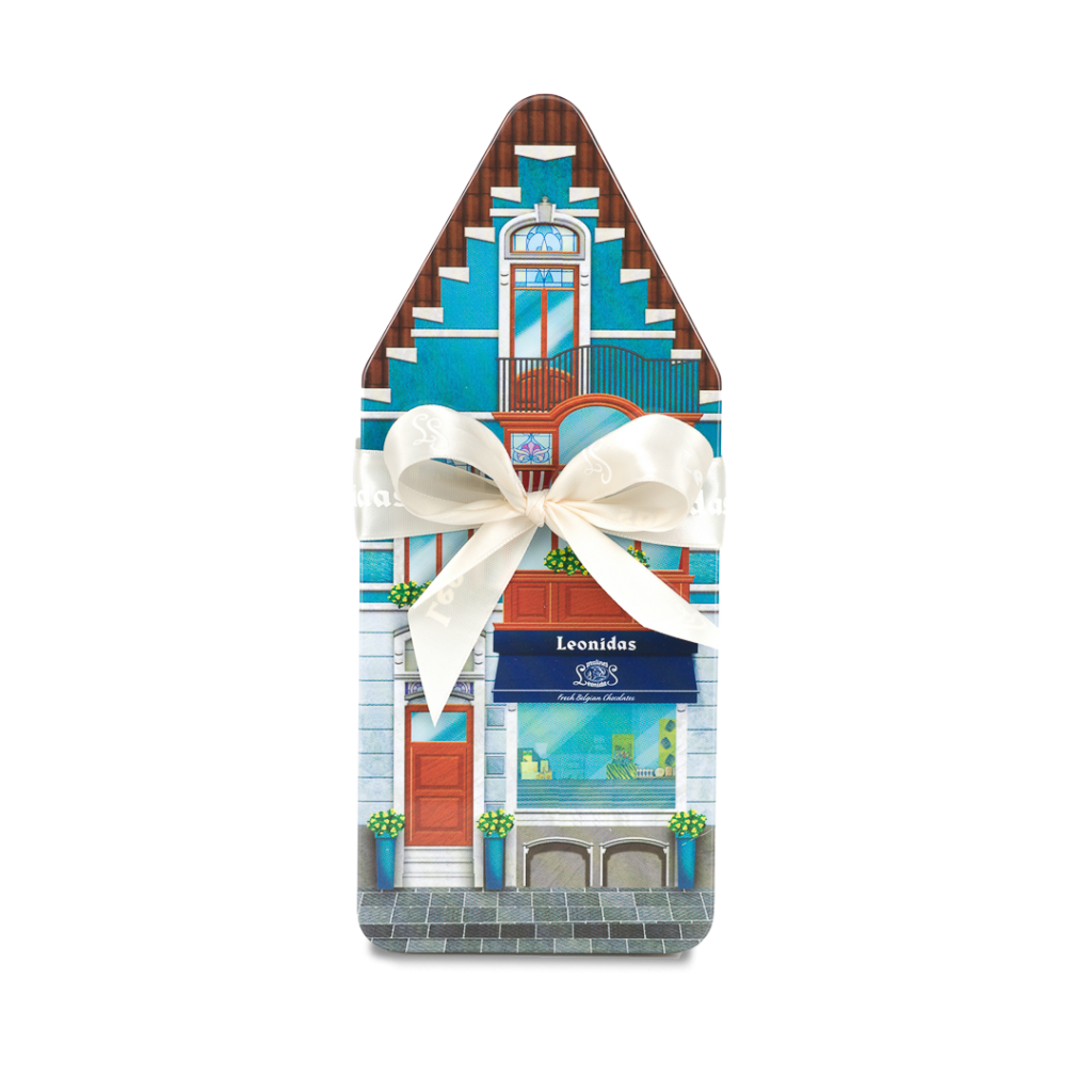 O selecție de 33 de praline asortate, din ciocolată belgiană de cea mai bună calitate, în cutie metalică elegantă, în formă de căsuță tradițională din Belgia. Un cadou dus la rang de artă, care amintește de rafinamentul cutiilor cu ciocolată din Europa începutului de secol. Punga de cadou și hârtia din mătase sunt incluse. Poza este cu titlu de prezentare, iar pralinele și panglica pot diferi.