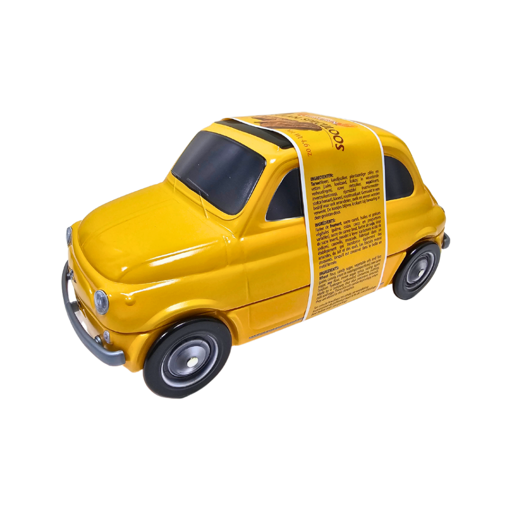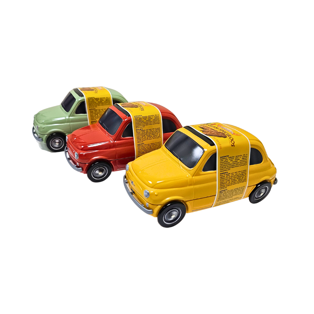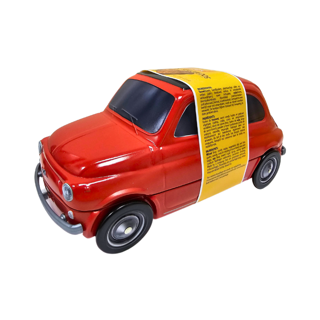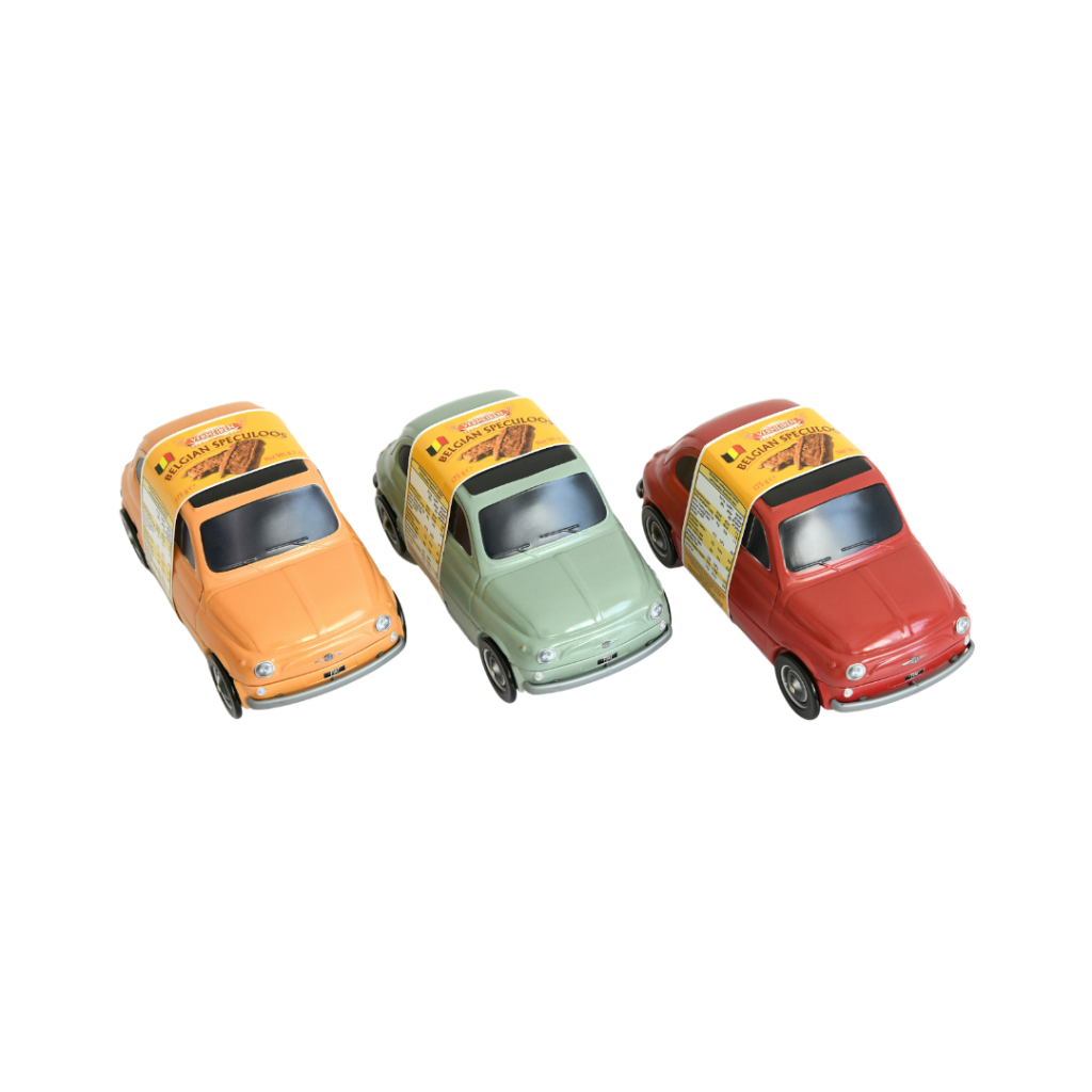 Mașinuță metalică, Fiat 500, cu roți mobile, ce include două pachete de biscuiți speculoos Vermeiren. Mașinuța este disponibilă în trei culori: verde deschis, galben și roșu. Modelul mașinuței este ales aleatoriu. Mașinuța cu biscuiți este un cadou minunat pentru cei mici care se vor bucura din plin de mașinuță, dar și de gustul delicios al biscuiților realizați după rețele tradiționale, fără conservanți, fără coloranți și fără arome artificiale.