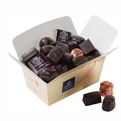 Selecție 16 praline ciocolată neagră în cutie standard. Pungă cadou și hartie mătase incluse. Poza este cu titlu de prezentare iar pralinele și panglica pot diferi.
