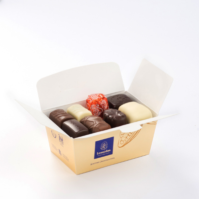 Selecție 16 praline asortate în cutie standard. Poza este cu titlu de prezentare iar pralinele, hârtia de ambalare și panglica pot diferi. Pungă cadou și hartie mătase incluse.