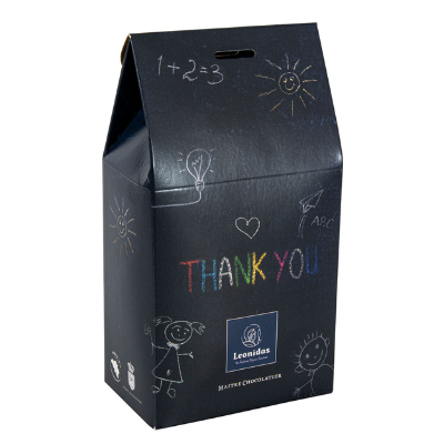 Cutie cartonată cu design cu text și model de școală, umplută cu praline din ciocolată belgienă, asortate. Cutia Thank You este perfectă pentru a-ți arăta recunoștința, la început de școală.