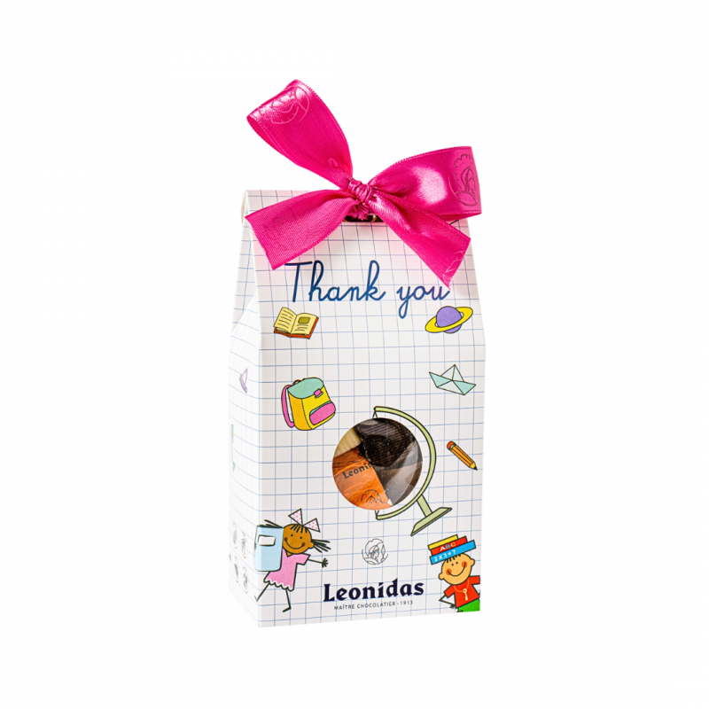 Mix Thank You White Leonidas este o cutie cartonată cu model de școală și print tip hârtie de matematică, umplută cu praline din ciocolată belgienă Leonidas, asortate. Cutia Thank You White este perfectă pentru a-ți arăta recunoștința pentru întregul an școlar!