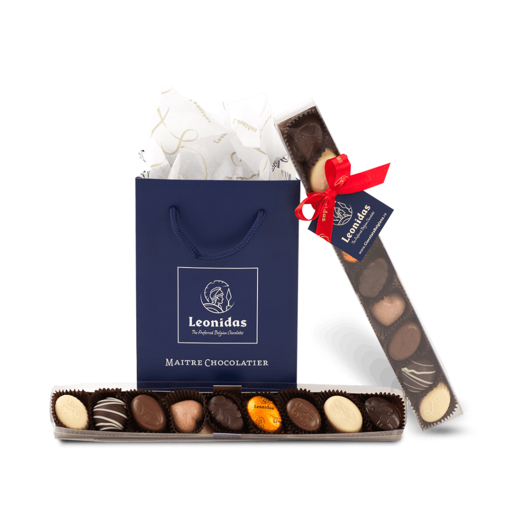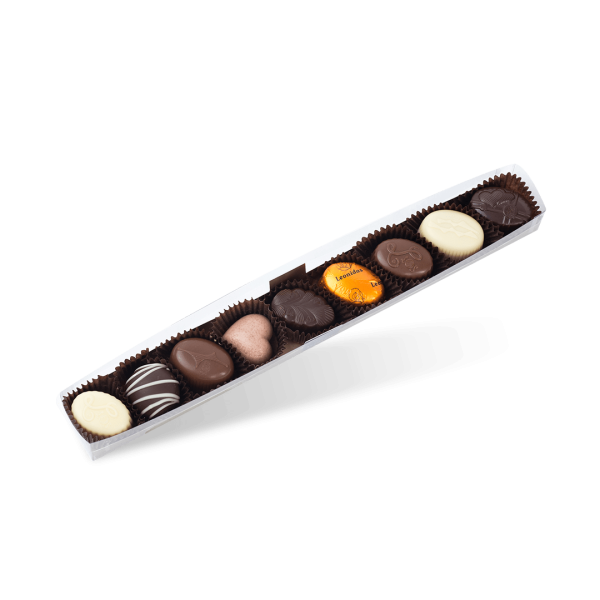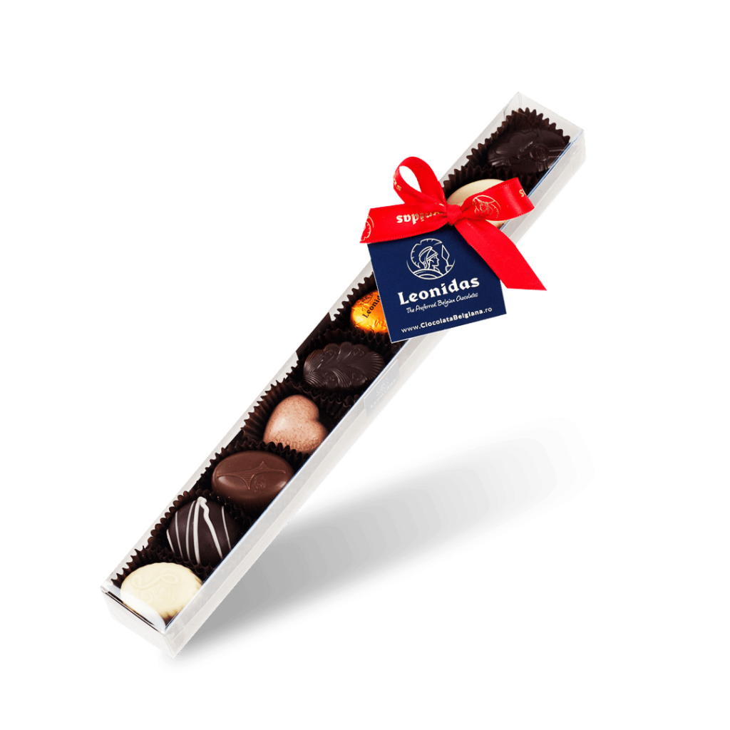 O selecție de 9 praline asortate din ciocolată belgiană de cea mai bună calitate, sub formă de rigletă. Poza este cu titlu de prezentare, iar pralinele și panglica pot diferi.