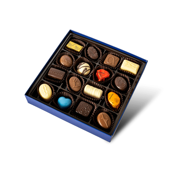 Selecție de 16 praline asortate în cutie elegantă cu capac auriu. Cutia Zanzibar Gold, cu praline din ciocolată belgiană, este perfectă pentru a fi oferită cadou. Pungă cadou și hartie mătase incluse. Poza este cu titlu de prezentare iar pralinele și panglica pot diferi.